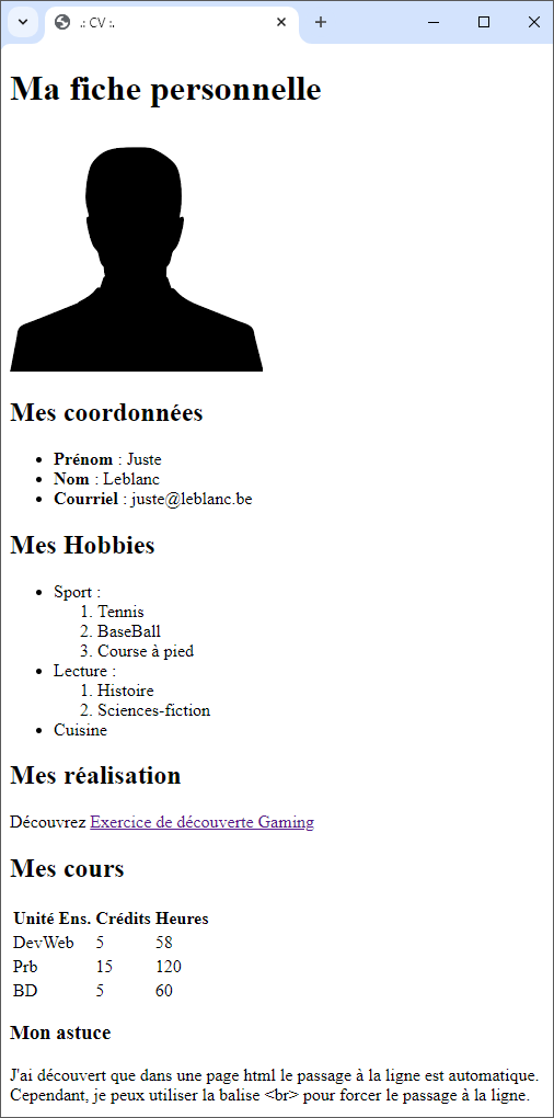 Avec FileZilla, transférez votre page sur le serveur Panoramix dans le dossier /public_html/exercices/labo1/ et visualisez-la à partir de son URL : https://panoramix.cg.helmo.be/~[votre_matricule]/exercices/labo1/maFiche.html